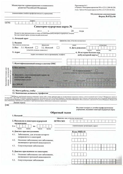 Бланк в обязательном порядке снабжен собственно санаторно курортной картой формы 072/у и обратным талоном для отрезания. Конкретные поля заполняются с учетом персональных сведений удостоверения личности пациента. Определенные обозначения предоставляются для категории пользующихся привилегиями людей. Причиной выдачи служит направление на курорт.